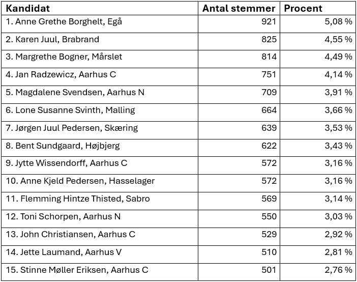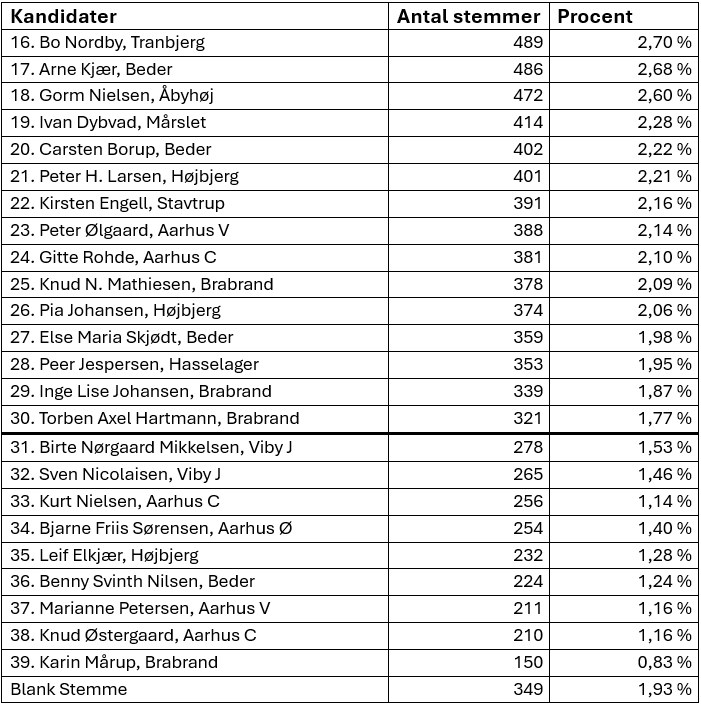 Valgresultatet for de øvrige opstillede kandidater, hvoraf de 15 øverste er suppleanter:
